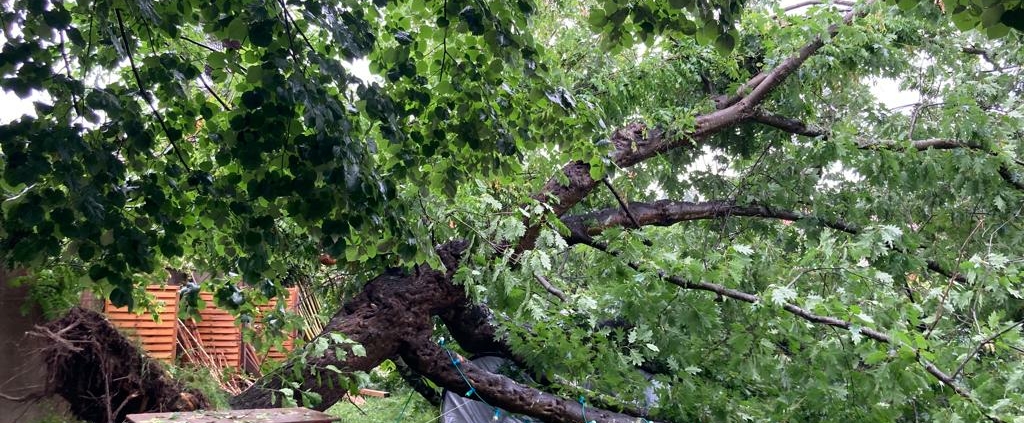 Ce mois de Juin fut marqué par un nombre exceptionnel d’orages, souvent violents, parfois destructeurs. Le chêne d’Amérique n’a hélas pas résisté et s’est déraciné. Il a fallu le débiter entièrement et le broyer, ce qui fut laborieux !