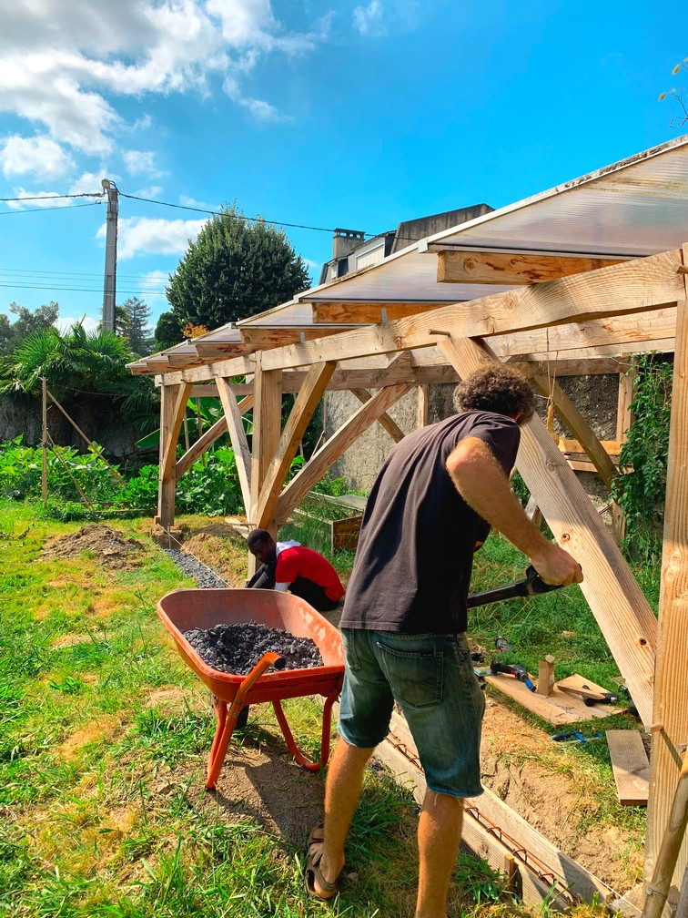 Poursuite des travaux : il faut à tout prix avancer sur les semelles béton entre les poteaux de la serre (pour la pose de vitrage) et terminer le séchoir solaire. Ce mois d’août fut intense !