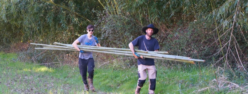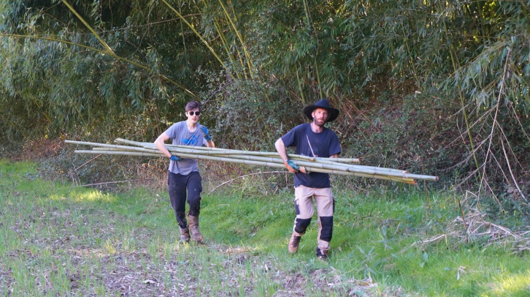Régulièrement, nous prélevons des bambous pour subvenir à nos besoins de constructions. Comme tous bons cueilleurs nous ne pourrons pas révéler notre coin (à moins d’être vraiment intimes). Heureusement on trouve des bambous un peu partout et c’est un formidable matériau de construction. Vous avez des bambous chez vous ? Ne les éradiquez pas ! Il est aussi possible de récolter les jeunes pousses au printemps, qui se mangent à la manière des asperges. Avec les cannes vous pouvez faire des tuteurs, des meubles, des toitures, des pailles, des canalisations, des tressages, objets divers…