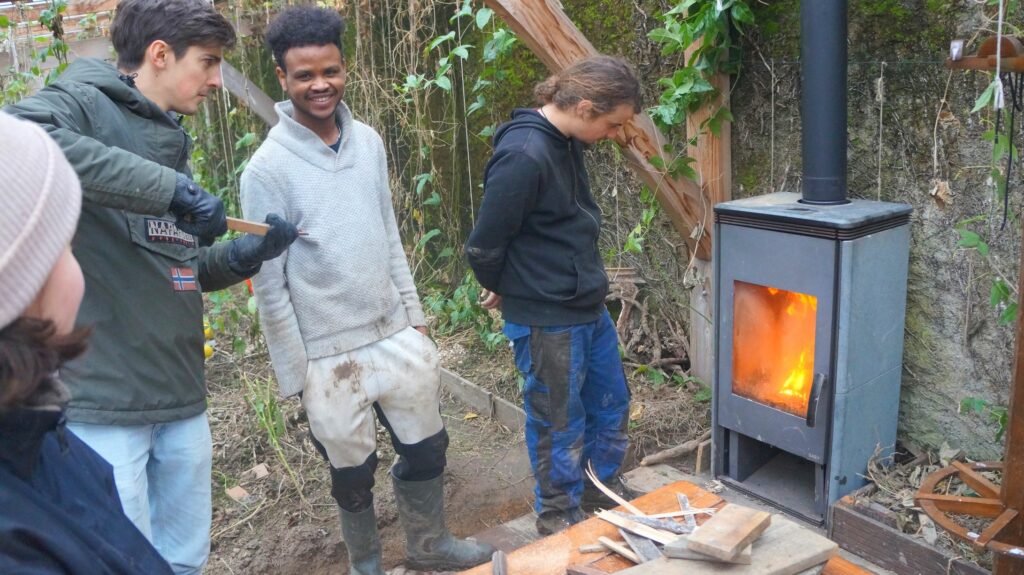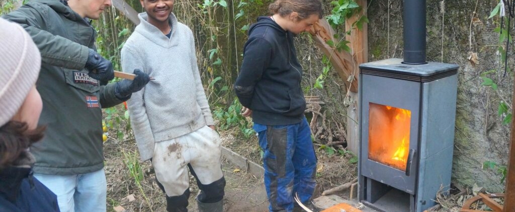 Maximilien est revenu passer quelques jours au jardin en tant que bénévole pour participer à tout un tas de tâches, et entre autres l’installation du tuyau de poêle. Car oui, autant le poêle de la serre était bien posé, autant n’ayant pas encore de tuyau il ne servait à rien. Ce qui était fort dommage, puisque si l’on a besoin d’un poêle c’est bien au mois de Janvier. L’opération fut complexe et plutôt coûteuse (le conduit coûtant plus cher que le poêle en lui-même, qui a été récupéré), mais réussie.