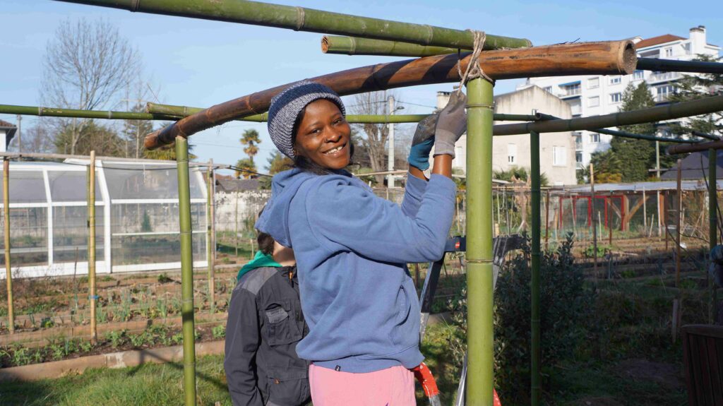 Nous avons par ailleurs entrepris la construction d’une pergola en bambous, avec l’aide de Bianca en stage pour deux semaines au jardin.