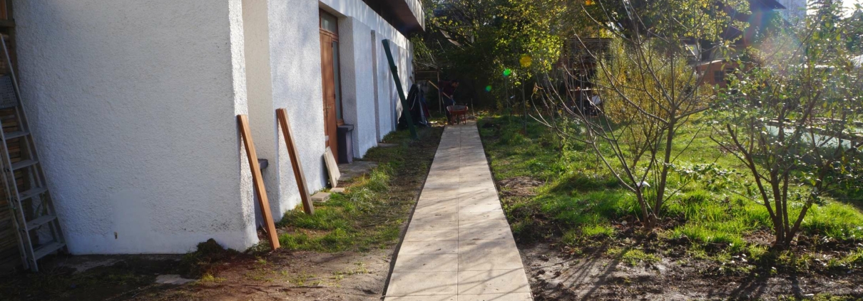 Je vous avais parlé de dalles, au mois de Septembre il me semble, nous avons donc de belles allées en dalles et c’est très plaisant. Cependant il reste encore beaucoup à faire, et nous avons par bonheur pu mettre la main sur un nouveau lot de dalles, alors c’est reparti ! Objectif : daller toute l’allée qui mène au bureau, et dans laquelle nous pataugeons traditionnellement tout l’hiver. Les Baptistes sont en première ligne et font leurs premières armes.