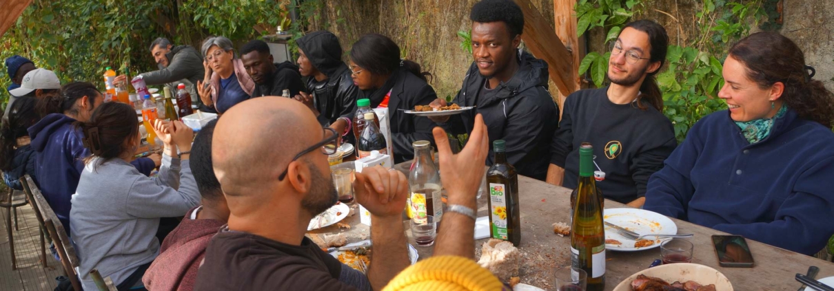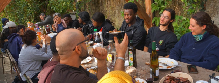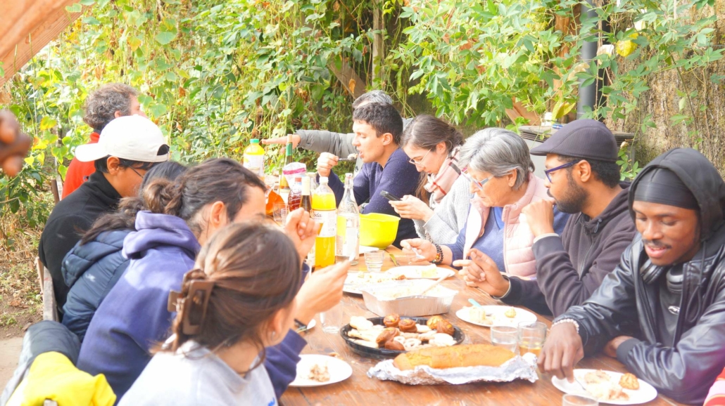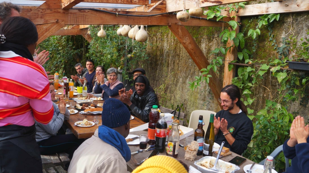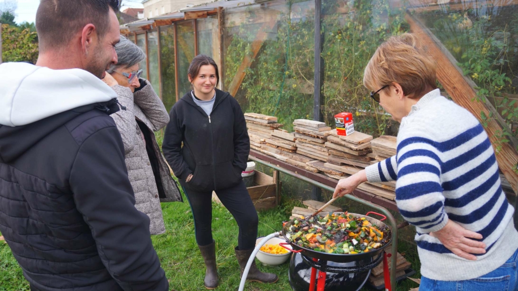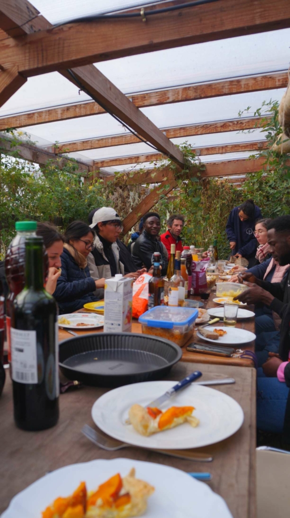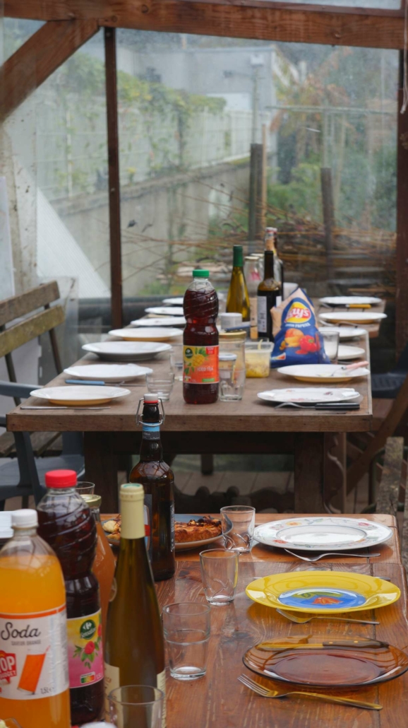 A l’heure du froid de Décembre, de la guerre des drones qui fait rage, du budget qui peine à être voté, de l’instauration d’un service militaire, de la crise qui secoue l’agriculture, du Moyen-Orient toujours en proie aux flammes, nous avons décidé de faire un repas de Noël. Non pas que les sujets précédents nous passent au-dessus, nous dirons seulement qu’ils passent au-dessus du jardin. Et comme nous regardons surtout la terre, c’est en toute simplicité joyeuse que nous fêtons Noël autour d’un bon repas cuisiné avec le meilleur des produits du jardin, agrémenté de préparations diverses apportées par les uns et les autres. Nous étions 28 personnes à nous tenir chaud dans cette petite serre !